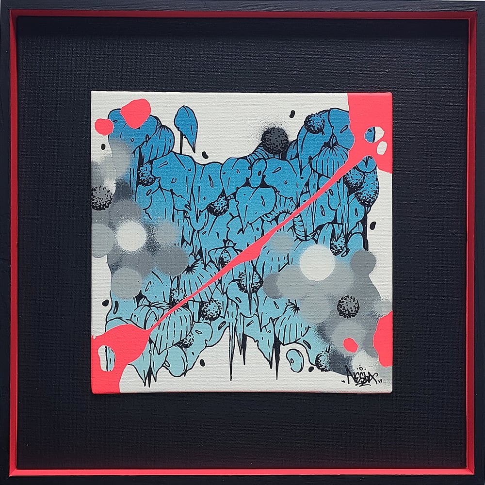 "Neotronic Vegetativ" est une œuvre de petits formats, entièrement réalisée à l'aérosols et à l'acrylique, sur un carton entoilé d'un format de 20x20cm. Encadré dans une caisse américaine format 32x32cm